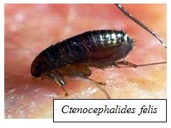 The most common species affecting domestic animals, both cats and dogs, is the cat flea, Ctenocephalides felis (cat flea). Other species known to affect domestic animals are Ctenocephalides canis (dog flea), Echidnophaga gallinacean (poultry sticktight flea) and Pulex irritans (human flea). Fleas can be found outside in the environment or hitching a ride from other animals around you. They have a darkly colored, hard body that is laterally flattened (squished from side to side). This body shape helps the flea to move between the hairs or feather on its host's body. They can also be vectors for more serious diseases and parasites including tapeworms and heartworm disease, and the bacteria that cause typhus and bubonic plague.